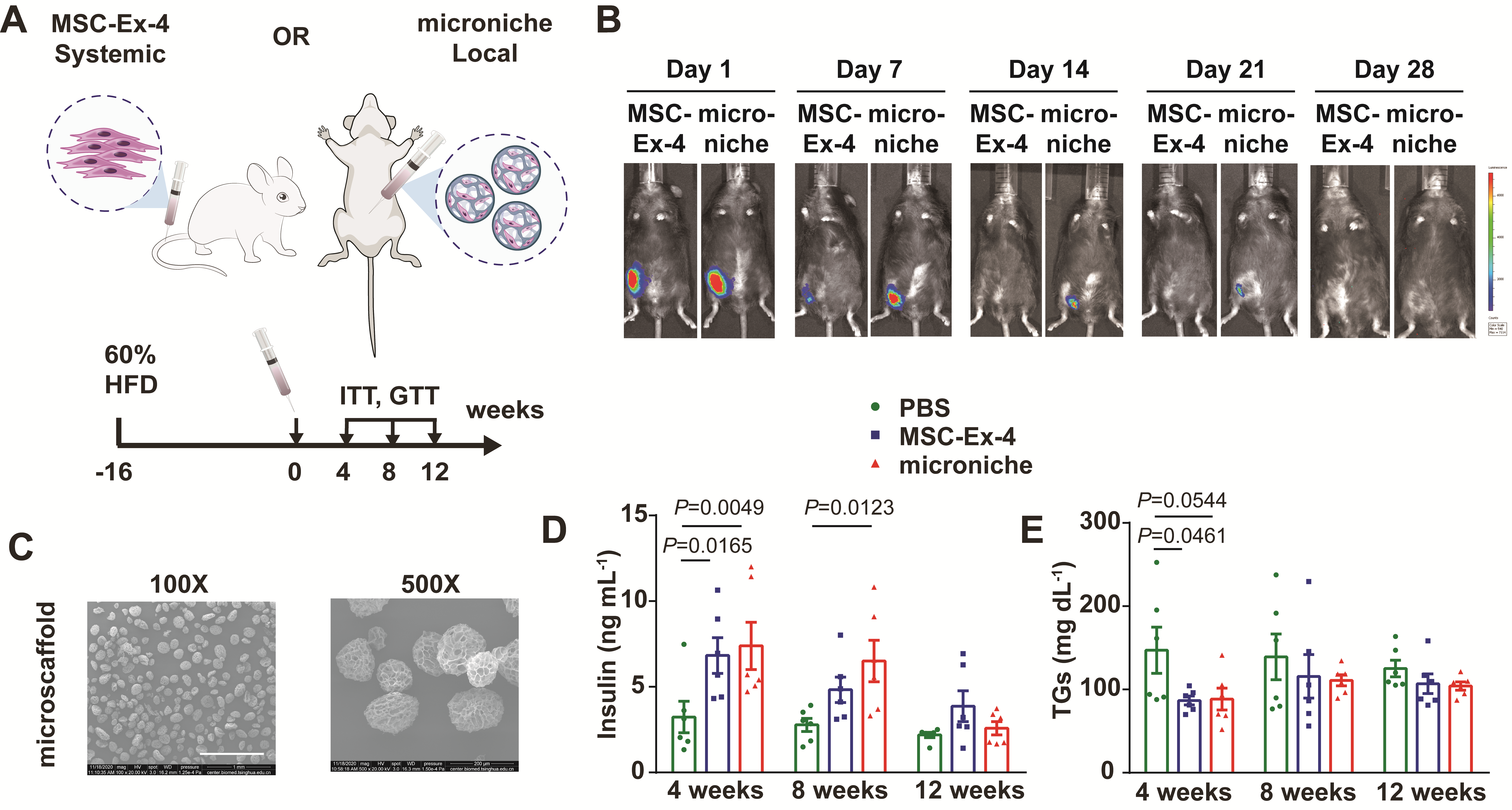 最后,研究团队利用3D多孔明胶微支架(微载体)对MSC-Ex-4细胞进行包裹和体内递送。该多孔微载体相关技术为课题组前期开发,可作为干细胞生长的微环境(microniche) 辅助高效干细胞治疗, 并且由北京华龛生物科技有限公司进行了转化和商品化, 相关明胶微载体产品分别获批中国药监局首款细胞用药用辅料资质和美国FDA首款细胞用DMF药用辅料资质。在此明胶微载体的辅助下,单剂量皮下注射可进一步延长MSC-Ex-4在体内的存活时间至一个月。而血清胰岛素、甘油三酯(TGs)水平以及葡萄糖耐量等指标也显示该微载体作为细胞药剂可增强MSC-Ex-4治疗效果达两个月以上。这些发现为MSC-Ex-4和明胶微载体联用改善包括糖尿病和代谢相关脂肪性肝病(MAFLD)在内的代谢功能障碍疾病以及其他相关并发症(如糖尿病足,糖尿病严重下肢缺血等)提供了新的策略和方法(图4)。