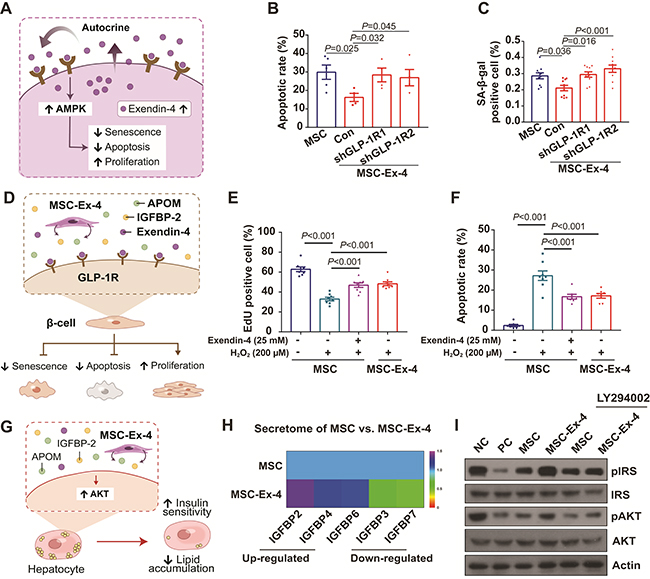 图2. MSC-Ex-4在高糖环境下抗凋亡和抗衰老能力增强,细胞内AMPK信号通路被激活(A-C)。同时MSC-Ex-4可促进胰岛细胞增殖和抑制凋亡(D-F),并通过分泌因子激活肝脏细胞PI3K-AKT信号通路(G-I)。