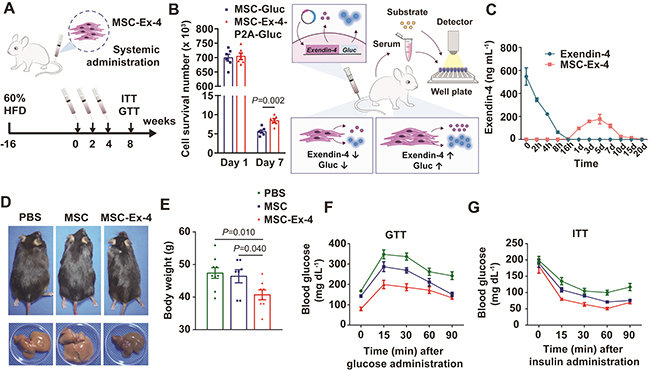图3. MSC-Ex-4系统性注射治疗示意图(A)。MSC-Ex-4注射一周后在体存活数量增加(B),同时Exendin-4达峰时间显著延长(C)。小鼠代谢表型显著改善(D-G)。