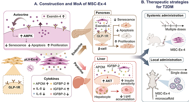 图1. MSC-Ex-4的构建示意图,对胰腺和肝脏细胞的潜在作用机制和对T2DM的治疗策略。(A)通过慢病毒转导系统构建Exendin-4基因工程MSCs (MSC-Ex-4),在不断释放Exendin-4的同时可对APOM、IGFBP2等蛋白因子分泌进行调节。其中,MSC-Ex-4分泌的Exendin-4可通过自分泌与自身的GLP-1R相互作用延长其在高糖应激下的抗逆能力。同时MSC-Ex-4分泌的Extendin-4可通过内分泌作用结合胰腺β细胞GLP-1R受体保护胰岛,且分泌的其他因子通过旁分泌作用改善肝脏细胞胰岛素敏感性,减少肝脏细胞脂质积累。(B)多次系统性注射可以显著改善二型糖尿病症状。通过注射3D明胶微支架辅助MSC-Ex-4作为细胞包封和给药载体,单次局部给药可实现长效治疗效果。