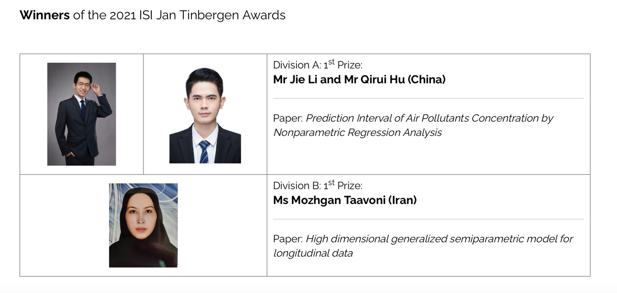 AG(中国)AG·官方网页版网9月13日电 近日,统计学研究中心2017级博士研究生李杰、2020级博士研究生胡祺睿斩获国际统计学会(International Statistical Institute, ISI)颁发的国际统计学会2021年度简·丁伯根奖一等奖(2021 ISI Jan Tinbergen Award Division A First Prize)。
