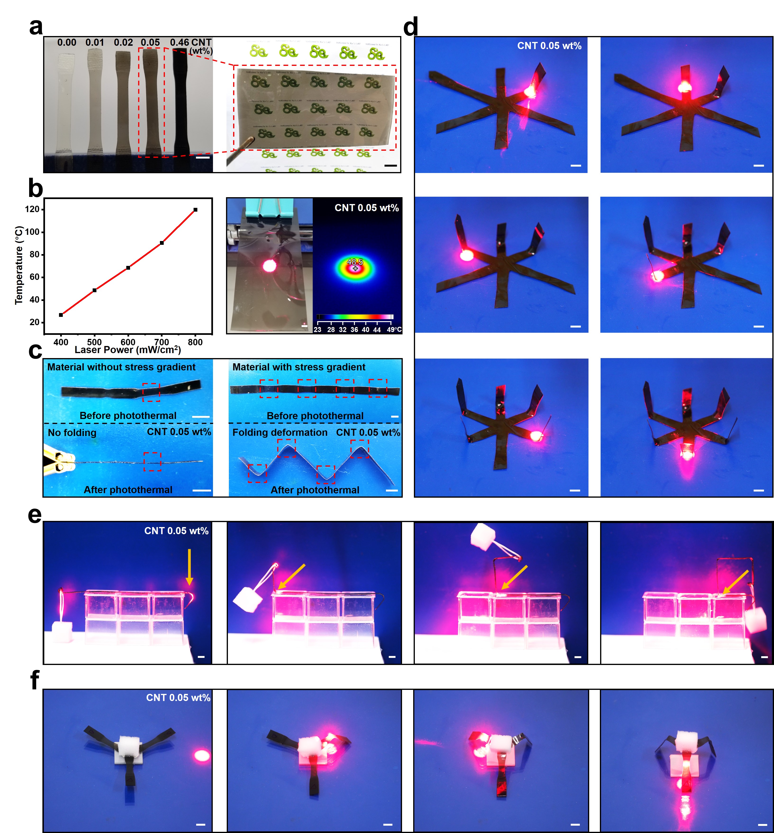 利用光热效应来代替传统的加热方式,还可以实现材料的序列变形。该团队通过向材料中掺杂一定含量的碳纳米管,制备得到了黑色半透明的二硒形状记忆材料,实验表明该材料具备良好的光热性能。通过对该材料进行应力编辑并配合660nm激光辐照,可以实现六臂材料的序列折叠过程。相对于整体的同时变形,这种具有时间分辨的序列变形模式可以大大增加材料三维形状的复杂程度。此外,利用该序列变形模式还可以进一步实现包含物体搬运和自支撑在内的一系列致动过程。