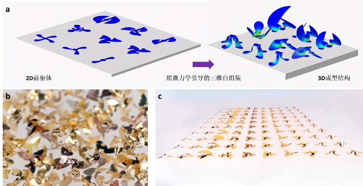图1.三维飞行器结构的引导屈曲组装过程与大规模多尺度制备