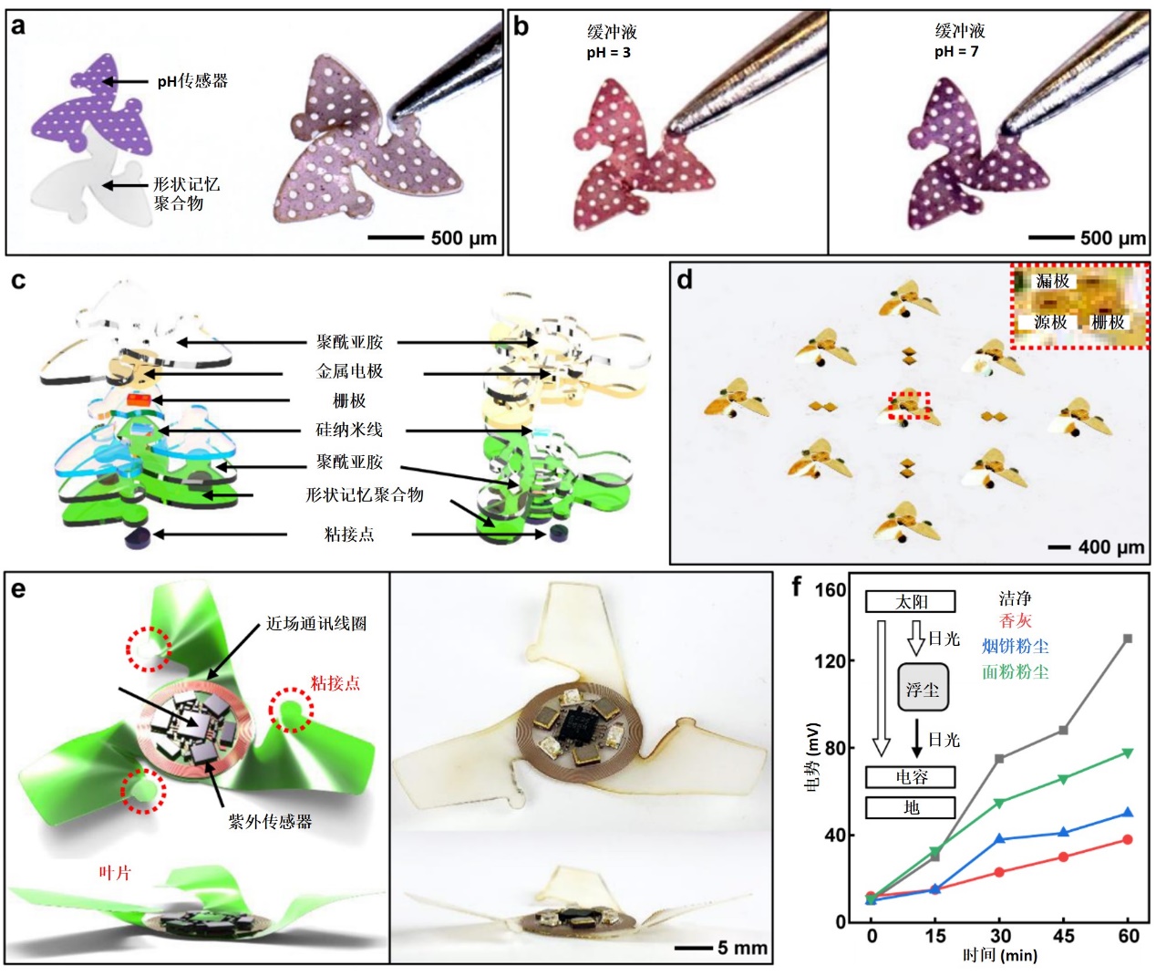 基于理论研究与结构设计,利用有限元模拟电子系统的组装过程。在飞行结构上集成微电子器件,包含天线、微控制芯片和紫外传感器。高空释放后,可对空气污染物长时实时监测。集成不同芯片,有望实现城市传染病病原体分布监测等。其可成为未来飞行器“物联网”节点,助力疫情监测与防控(图2)。
