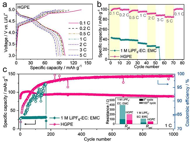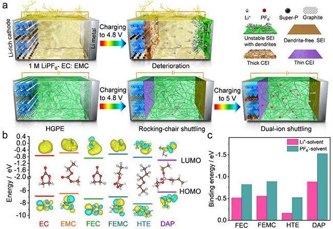 文章报道的凝胶电解质是通过在全氟化电解质中加入磷酸二乙酯(DAP)单体原位共聚制得的,其表现出高安全性(不可燃和不漏液)、高离子电导率(25°C下1.99mS cm-1)、宽电化学窗口(>5.5 Vvs.Li/Li+)以及与锂金属负极(锂沉积/剥离库仑效率为99.7%)和石墨正极(1000次循环后容量保持率为93%)的良好相容性。研究表明,Li+在2.0-4.8V的电压范围内从LRO正极脱出,随后在4.8-5.0V的电压下,PF6-阴离子相继插入到KS6石墨导电剂中。在HGPE 中,电解质中的氟代溶剂组分有效提高电解质的氧化稳定性,同时,其与含磷单体的协同作用构建了稳健的SEI/CEI膜,提高了电极的相容性。此外,聚合物基质通过强相互作用有效地阻止了Li+/PF6-离子向SEI/CEI 表面缺陷的迁移,从而有利于均匀的Li+/PF6-离子促进均匀地沉积/嵌入。