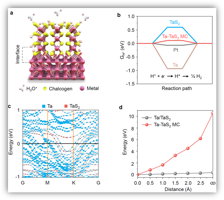 该研究通过一种定向固相合成法从金属基底衍生制备出大面积金属性二维材料电催化剂,金属基底与金属性二维材料共价结合并构建出一个近零电阻界面,该界面的电荷传输快、界面结合力强。第一性原理计算表明,金属基底可向催化剂中有效注入大量电荷,优化氢吸附自由能,提高催化活性;此外,能带结构图解析结果显示,金属基底与金属性二维材料均能在费米能级处贡献大量自由电子,这表明由金属基底与金属性二维材料组合的同源单体析氢电极展现出与金属相同的电学性质,进一步的电学测试结果也验证了这一结论。将该源单体析氢电极直接用于电解水析氢反应,其在2000 mA cm-2的工业大电流密度下仅需398 mV的过电位,优于大多数文献报道结果。此外,该析氢电极在大电流(200 -1000 mA cm-2)工况下持续200小时的析氢反应后性能无衰减,表现出具备工业应用条件的大电流析氢稳定性。进一步的研究表明,以该同源单体析氢电极为阴极、商业氧化铱为阳极组装在电解水器件中,其表现出优于商业铂基析氢电极的电解水性能,仅在1.98 V的施加电压下就实现了1000 mA cm-2的析氢电流密度,法拉第效率接近100%。该同源单体析氢电极制备成本低、催化性能高,在工业电解水制氢电极中具有规模化应用前景。以上研究结果同时为构建电解水制氢电极提供了新思路,相关策略有望进一步拓展到其他应用电极材料体系中。