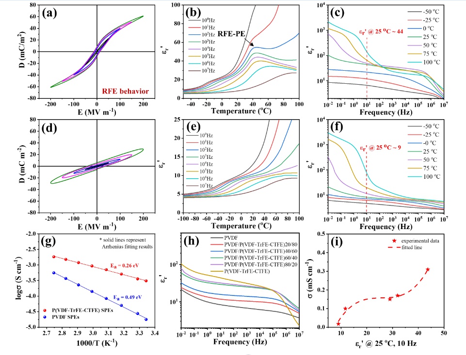 图2.PVDF和P(VDF-TrFE-CTFE)的铁电行为、介电行为和离子电导率表征