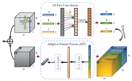 伪3D自相关模块(P3AB)的内部实现细节图:经过1D快速卷积和自适应特征融合(AFF),输出包含水平、垂直和通道三个方向的自相关并以等尺寸融合。红色箭头表示操作流程。