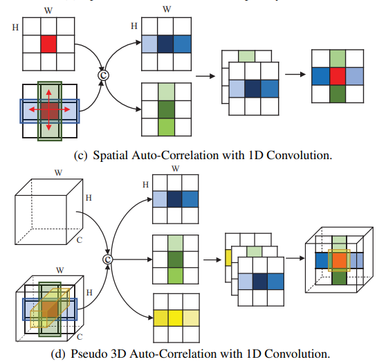 提取伪3D全局自相关特征的示意图:输入为大小为H*W的特征图,每个位置(如红色)可以从其他像素收集信息,(c)图为2D形式,从水平和垂直两个空间方向提取相关性,(d)图为3D形式,从空间域的水平、垂直和通道域方向提取相关性并融合。