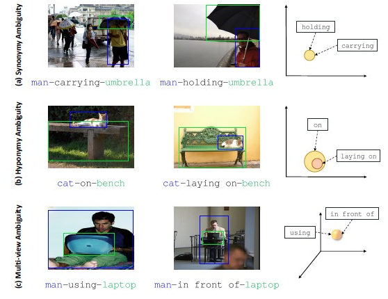 数据集中存在的视觉关系语义歧义样例图:即相似的视觉场景可以用多个合理的谓词描述。(a)同义词歧义,(b)上下位词歧义,(c)多视点歧义。