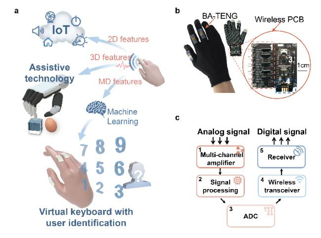 通过提取和分析以上多维信号特征,不同维度的人机交互得以实现,包括智能家居(如灯光控制)、机械手控制以及可实现用户识别的虚拟键盘(其识别准确率可达93.1%)。独特的基于跨阻放大器的信号调理电路消除了多通道信号实时传输中的大部分串扰及噪声,增强了系统的鲁棒性。该工作为开发多维人机交互提供了新思路,在未来人机交互应用中有巨大潜力。