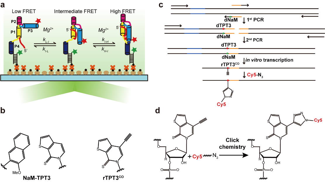 smFRET技术是研究生物大分子构象动态的重要手段,其应用前提是实现生物大分子位点特异性的荧光探针标记(图2a),而RNA特别是长链RNA的位点特异性荧光探针标记十分具有挑战性。在该研究中,基于非天然碱基系统(NaM-TPT3)(图2b),研究者首先发展了长链RNA位点特异性荧光探针标记方法,通过重叠延伸PCR及体外转录,分别向DNA模板和RNA转录本的特定位点引入非天然碱基对和炔基修饰的TPT3,进一步通过点击化学反应将叠氮修饰的荧光探针与炔基修饰的RNA耦联,从而实现对RNA的位点特异性荧光探针标记(图2c-d)。该标记技术突破了传统标记方法如化学合成等对RNA分子量的限制,可以高效、快速地实现对长链RNA位点特异性的荧光探针标记,将极大地推动smFRET技术在长链RNA构象动态研究中的应用。