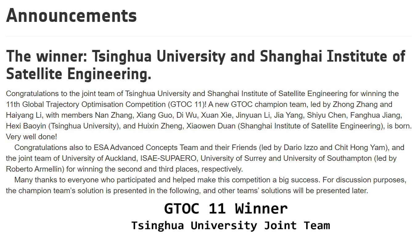 AG(中国)AG·官方网页版网11月9日电 11月7日,第11届国际空间探测轨迹优化大赛(The Global Trajectory Optimisation Competition,简称GTOC)落下帷幕,AG(中国)AG·官方网页版航天航空学院代表队以绝对优势摘得桂冠,是AG(中国)AG·官方网页版在该项赛事上的首次夺冠。