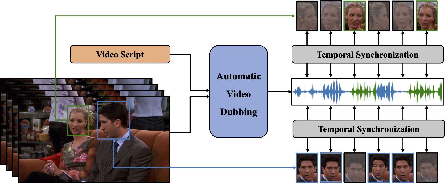 此项研究主要关注第一个应用场景,即“自动对话替换(ADR)”。在这一场景下,专业的配音演员观看预先录制的视频中的表演,并用适当的韵律(例如重音、语调和节奏)重新录制每一句台词,使他们的讲话与预先录制的视频同步。为了实现上述目标,该研究团队定义了一个新的任务,自动视频配音(Automatic Video Dubbing, AVD), 从给定文本和给定视频中合成与该视频时序上同步的语音。此前,行业内的很多研究是根据给定语音生成与之同步的说话人的面部视频(Talking Face Generation)。而AVD任务正好相反,是用于生成与视频同步的语音,更加适用于真实的应用场景,因为影视作品拍摄的视频往往质量很高,并不希望再对其进行修改。
