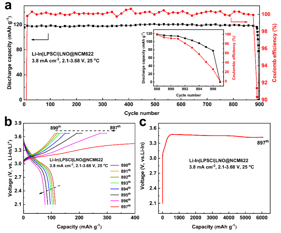 Li-In|LPSCl|LNO@NCM622电池的循环性能。(a)室温、3.8 mA cm-2下的长循环性能。(b)第890至第897个循环的恒流充放电曲线。(c)第897个循环的恒流充电曲线。