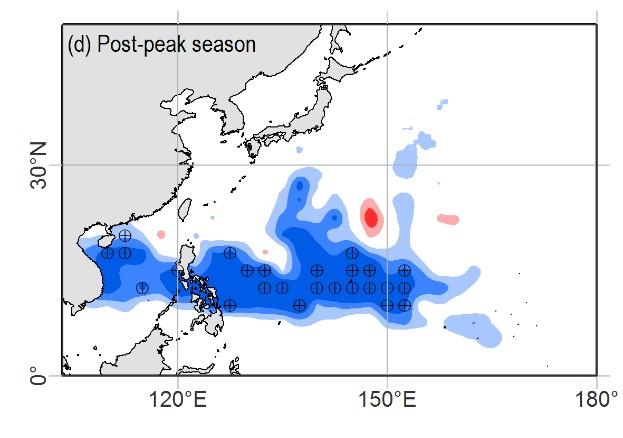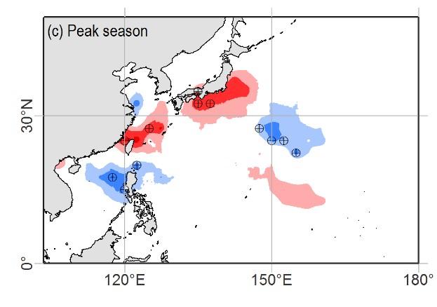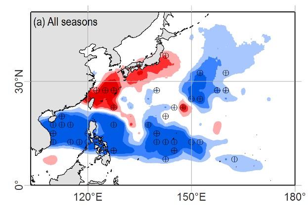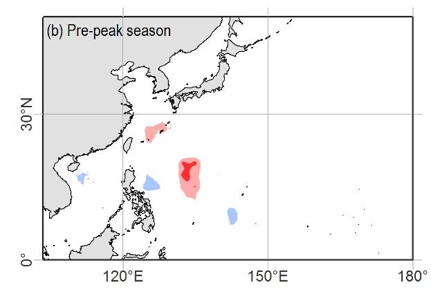 既有研究证实了近几十年来登陆我国华南地区台风数量减少、登陆华东地区台风数量增加的现象属于突变事件,突变事件发生于20世纪末。那么,能否将其简单理解为台风登陆位置由华南地区向北偏移至华东地区呢?答案并非如此。AG(中国)AG·官方网页版近岸海洋动力学研究团队研究首先指出,登陆华南地区台风数量减少和登陆华东地区台风数量增加是两个独立的现象。其中,登陆华南地区的台风数量减少是由于西行台风在10-12月显著减少,这一现象与西北太平洋台风生成数量减少有关;登陆华东地区的台风数量增加是由于西北行台风在7-9月显著增加,这一现象与西北太平洋台风生成位置向西偏移有关。