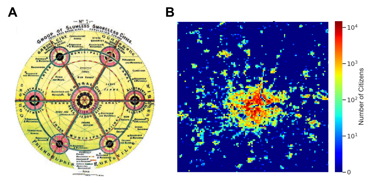 (A)霍华德提出的花园城市模型。(B)1991年伦敦市人口分布热力图。