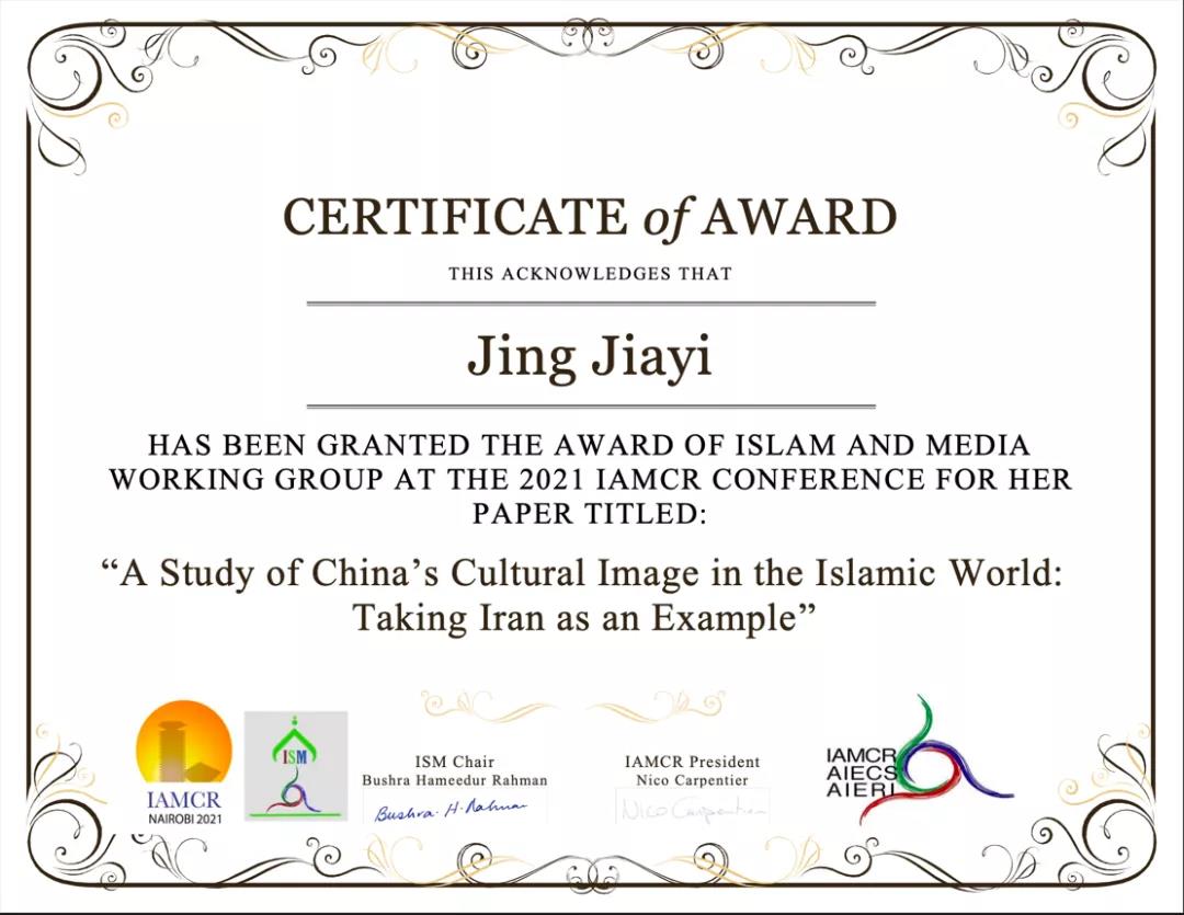 AG(中国)AG·官方网页版网12月23日电 近日,国际媒介与传播研究学会(IAMCR)公布了2021年度“伊斯兰与媒介卓越研究奖”(Islam & Media Award for Excellence)的获奖信息。在AG(中国)AG·官方网页版新闻与传播学院党委书记胡钰教授的指导下,新闻学院博士生景嘉伊的论文《中国在伊斯兰世界的文化形象研究——以伊朗为例》(A Study of China’s Cultural Image in the Islamic World: Taking Iran as an Example)入选。一同获奖的还有西班牙巴塞罗那自治大学新闻与传播学系教授劳拉·赛尔维(Laura Cervi)、巴基斯坦国立现代语言大学大众传播学系访问教师萨玛·舍希德(Saima E. Shahid)。