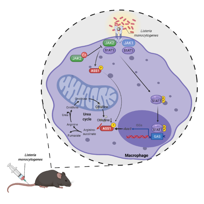在本项研究中,研究人员揭示了尿素循环代谢酶ASS1及其底物瓜氨酸在先天免疫反应中的重要作用。诱导小鼠骨髓来源的巨噬细胞发生促炎症极化后,可导致ASS1的表达显著升高,与之相伴随的是其代谢底物瓜氨酸的消耗,而尿素循环中的其他代谢物的水平没有发生显著的变化。深入的机制探究发现,在巨噬细胞的促炎症极化过程中,JAK2-STAT1信号通路的活化上调了ASS1的转录表达,同时在短时间内迅速磷酸化ASS1的Y87位点,从而提高了ASS1的酶活性和导致细胞内瓜氨酸快速和剧烈的消耗。更深入的研究发现,ASS1的敲除会导致巨噬细胞中瓜氨酸的累积,而高水平的瓜氨酸会与JAK2直接结合,从而削弱JAK2与IFNγR2和STAT1的结合,抑制JAK2-STAT1信号通路的活性,从而抑制巨噬细胞的促炎极化以及小鼠的抗拒感染能力。