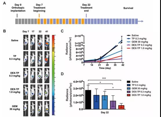 利用荧光素酶表达原位的MIAPaCa-2作者构建了原位的胰腺癌模型,用以进一步评估DEX-TP的治疗效果,记录肿瘤生长(生物发光监测)和小鼠生存情况,同时比较dex-TP、游离TP和PDAC一线化疗药物GEM等治疗方法(图3A)。