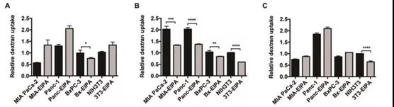 在体外细胞实验中,作者测定了巨胞饮抑制剂EIPA作用前后,4kDa, 70kDa, 150kDa等不同分子量的葡聚糖在两个KRAS突变细胞(MIAPaCa-2和Panc-1)和两个KRAS野生型细胞(BxPC-3和NIH3T3)的入胞效率。发现70kDa的葡聚糖在所有的测试细胞系中都表现出普遍的EIPA敏感性和巨胞饮的内吞依赖性。相比之下,虽然4kDa和150kDa的葡聚糖可以通过大胞饮作用内化到一些细胞中(4kDa的葡聚糖进入BxPC-3细胞(图1A),150kDa的葡聚糖进入NIH3T3细胞(图1C)),但它们与70kDa葡聚糖的依赖水平不同。