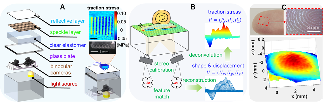 图1.界面三维接触应力测量方法示意图;(A)测量装置的多层结构示意图;(B)接触表面变形场测量和应力场计算原理图;(C)手指的接触形状表征