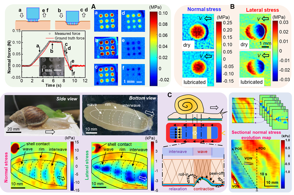 利用所设计的原型装置,不仅实现了对Hertz,JKR等经典接触力学模型的实验验证,还成功应用于多种界面力学行为的研究。粘着应力测量中,对微柱阵列干粘附表面的粘着应力演变进行了直接测量,这对仿生干粘附表面的结构优化设计和可靠性监测具有重要意义。滚动摩擦测试中,通过对比干接触和润滑条件下测得的滚动摩擦应力分布,直观展示了弹性阻力组分和表面粘着组分在不同接触区域对滚动摩擦起源的贡献。蜗牛的爬行机理研究中,基于蜗牛爬行过程的界面三维接触应力测量,对蜗牛爬行机理中经典的粘液“屈服-愈合”机制进行完善,系统研究了蜗牛空间爬行的力学机制,揭示了踏板波的微吸盘效应调控的局部润滑状态是蜗牛依靠摩擦不对称性爬行的关键,明确了蜗牛腹足的多尺度的吸盘效应和分段密封效应是其能够以水平、竖直和倒置等多种位姿进行空间爬行的重要力学基础。本研究所提出的方法展现的高时空分辨率的界面三维接触应力动态测量能力,在物理学、生物学和机器人等诸多科学和工业领域具有广泛应用前景。