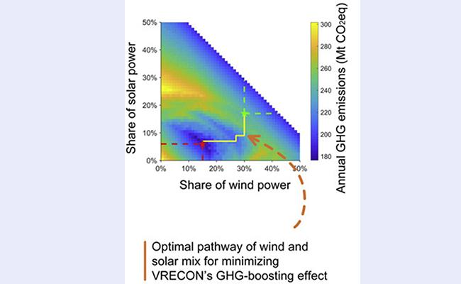 该研究进一步分析发现,由于挤出效应的存在,风电和光伏的组成比对未来几十年碳排放累积量的大小有关键性的影响。合理的风光比能最大限度的推迟挤出效应的发生,同时带来最和缓的碳排放增速,从而最小化碳排放的累积量。图1所示为美国得克萨斯州市场的风电和光伏比例最优演化路径。
