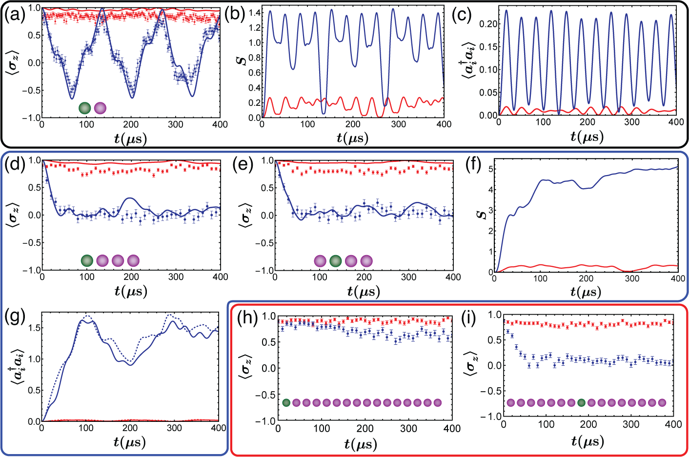 在量子动力学方面,拉比-哈伯德模型包含了离子的自旋模式和空间振动模式的相互耦合,这显著增加了该系统有效的希尔伯特空间维度,使得经典模拟难度增加。研究人员在小规模体系(2离子、4离子)下观测到了符合经典模拟预期的量子动力学演化,与量子相变一同证明了本实验中拉比-哈伯德模型的成功实现。而在大规模体系(16离子)和强耦合参数区间,常用的经典近似方法将不再适用,实验系统的有效态空间维度高达257,相关的动力学过程已经难以通过经典计算机模拟计算。该实验展示了基于离子阱平台的量子多体模拟,将空间振动自由度引入量子模拟中,实现了经典计算机难以计算的问题规模,是通向未来大规模离子阱量子计算、量子模拟的重要一步。