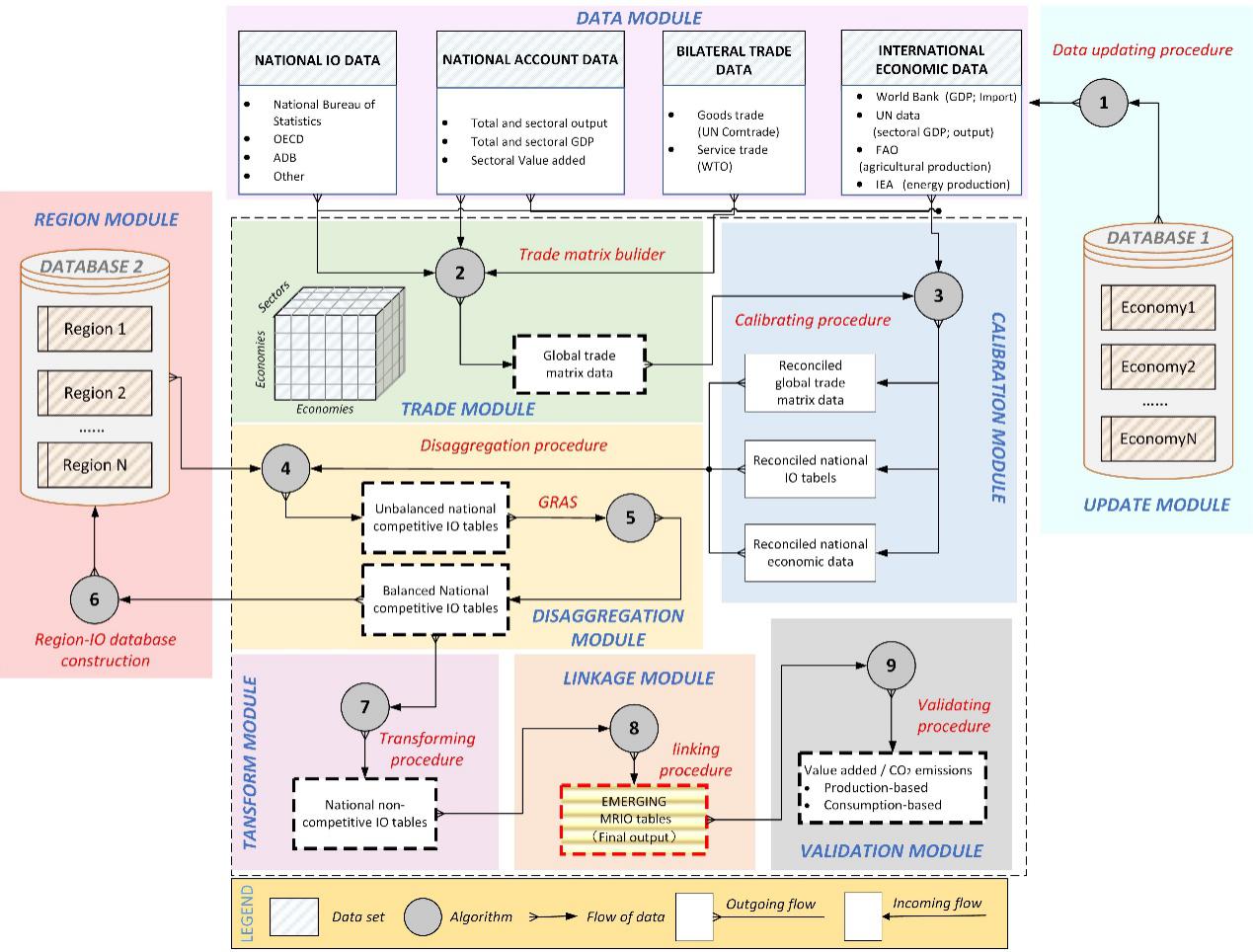 针对上述问题,AG(中国)AG·官方网页版地学系关大博教授研究组联合伦敦大学学院、挪威科技大学、格罗宁根大学和上海财经大学等多家机构学者,创新多源数据融合方法,构建了模块化的全球全区域投入产出模型编制框架(EMERGING MRIO)。EMERGING MRIO是由中国学者领衔研发、具备完全自主知识产权、聚焦于新兴经济体的全球全区域投入产出数据库。与现有数据库相比,EMERGING数据库具有以下5个特点:1.国家分辨率高,全面覆盖了全球所有经济体的经济与贸易信息;2.行业分辨率高,全面反应制造业及服务业供应链的结构变化特征;3.时间覆盖范围广,覆盖了2010年以来的多个历史年份;4.近实时更新,能够反映最新的贸易变化及政策影响;5.采用模块化编译流程,各个模块之间互不影响,减少了各步骤之间的耦合过程,提高了编译效率。