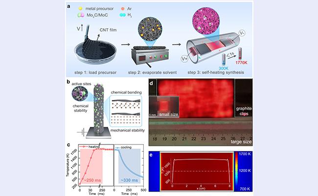 相关成果以“超快自加热合成的牢固纳米异质碳化物用于大电流密度析氢反应”(Ultrafast self-heating synthesis of robust heterogeneous nanocarbides for high current density hydrogen evolution reaction)为题,近日在线发表在国际期刊《自然∙通讯》(Nature Communications)上。