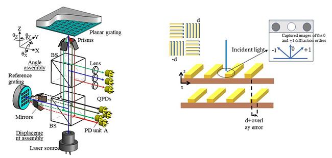 六自由度光栅编码器(左)、双层叠加光栅套刻误差DBO衍射测量示意图