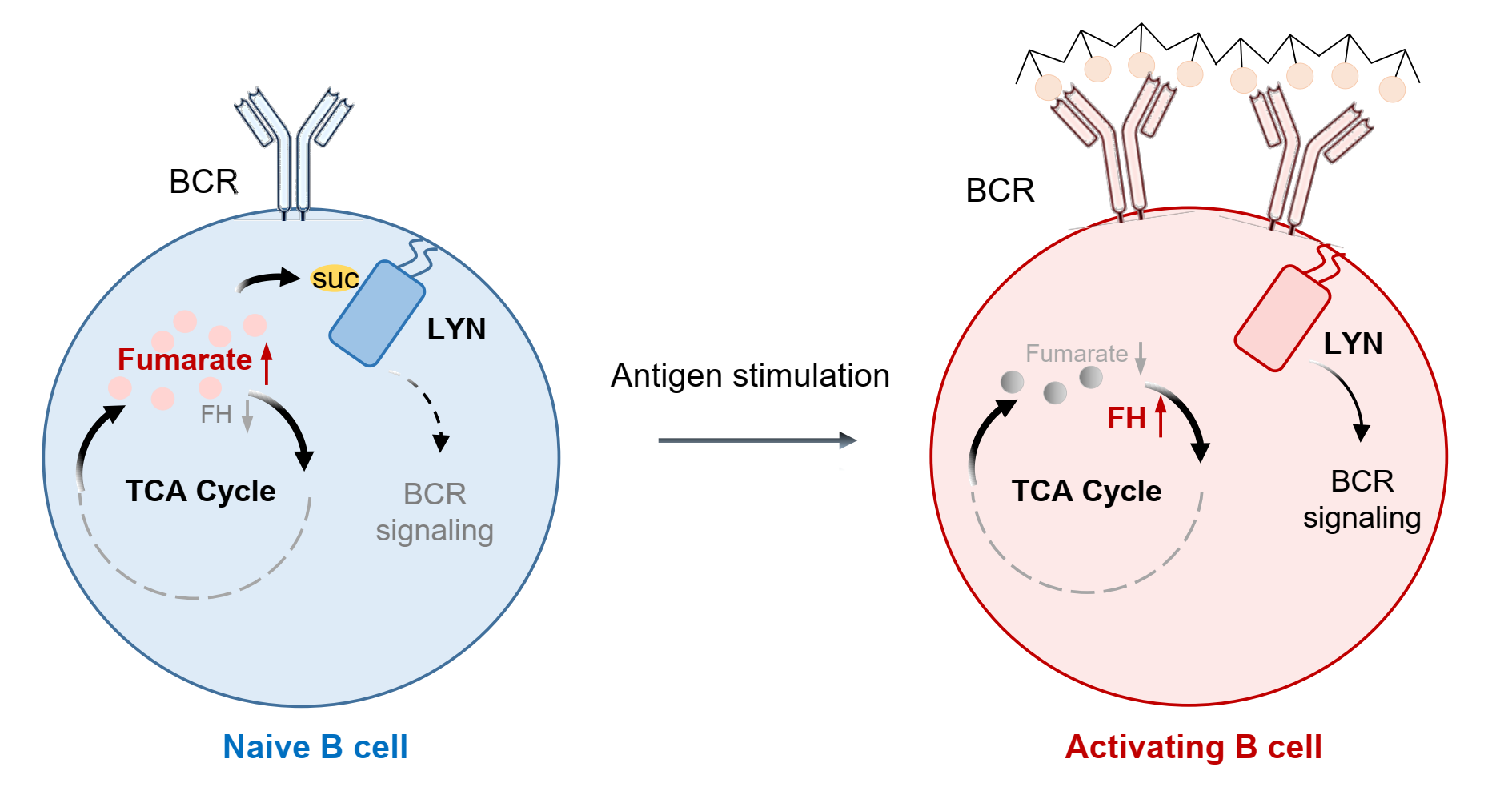 在B细胞激活过程中,延胡索酸水解酶(fumarate hydratase,FH)的表达快速提高,降低了细胞内延胡索酸的水平。抑制FH或加入外源延胡索酸(二甲基延胡索酸)则阻断BCR信号通路的激活、B细胞的增殖以及抗体的产生。进一步机制研究表明,延胡索酸可以琥珀酸化修饰LYN的C381位点,该位点的修饰有效抑制了LYN的活性。LYN是BCR信号通路中关键的酪氨酸激酶,琥珀酸化修饰LYN的C381位点在体外细胞和小鼠体内均抑制了B细胞的激活和功能。