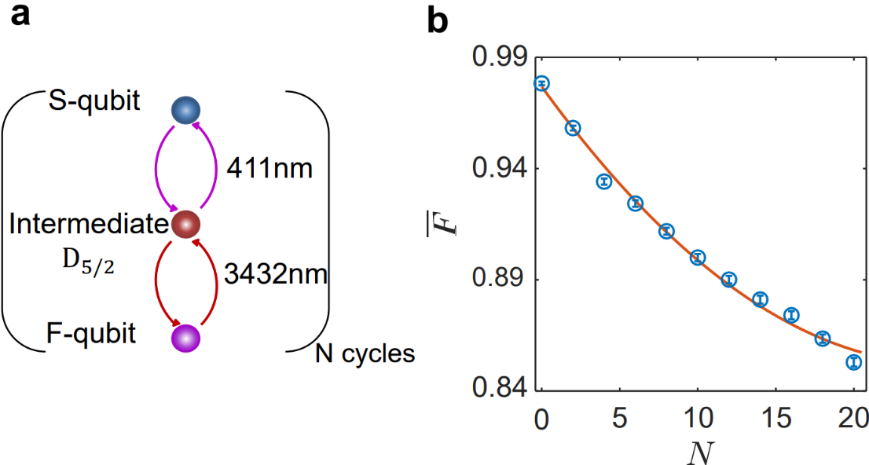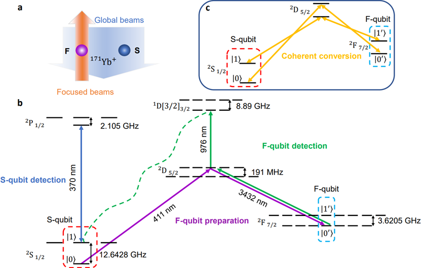 为了克服上述困难,段路明研究组在实验上利用同种离子的两对超精细结构能级分别编码了这两种类型的量子比特(S-qubit和F-qubit),利用411nm和3432nm的双色窄线宽激光实现了两种量子比特之间保真度99.5%的微秒量级相干转换,并演示了对其中一种量子比特进行初态制备、测量、单比特逻辑门、激光冷却等操作时,另一种量子比特的串扰错误率小于0.06%,低于容错量子计算约1%的错误率阈值。该技术解决了未来大规模离子量子计算和量子网络的一个关键难点。