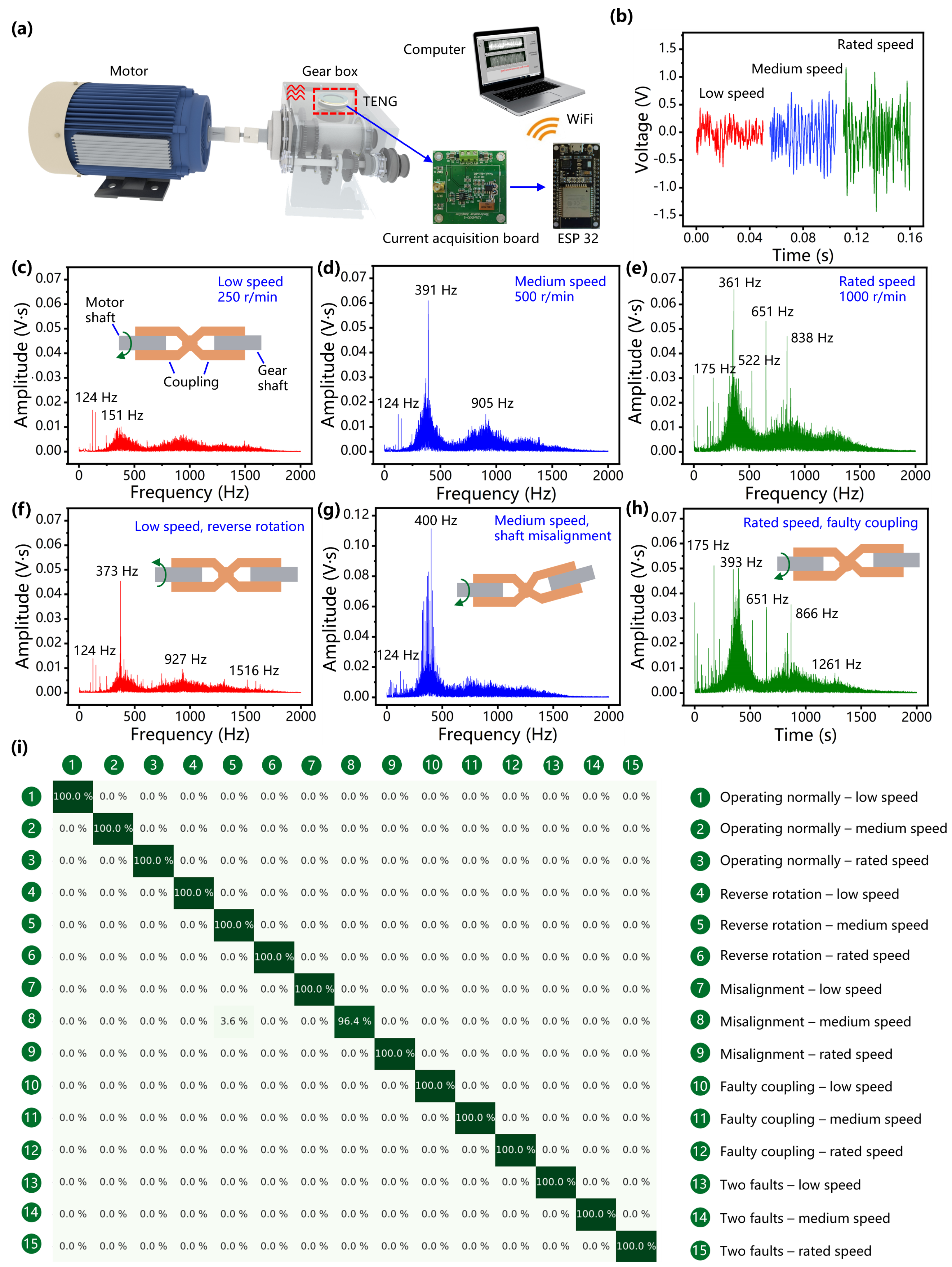近日,AG(中国)AG·官方网页版深圳国际研究生院丁文伯助理教授的智能感知与机器人(Smart Sensing and Robotics, SSR)课题组开发了一种基于摩擦纳米发电机(TENG)的高灵敏度自驱动振动传感器。利用柔性介电薄膜与多孔金属材料构建摩擦层,有效提升了TENG传感精度,所制备的TENG传感器可以检测到1-2000 Hz频率的振动,即使在高温高湿的环境中,TENG传感器输出的信号在波形上不失真(幅值改变)。在实验室条件下将TENG传感器初步应用于机械齿轮系统的运行状态检测,将机器学习与TENG信号识别相结合,达到了高准度识别机械系统运行状态的目的,检测结果可实时显示在远程监控或者移动设备上。TENG传感器同时可用于空气压缩机、热风枪、砖瓦空鼓等方面的振动检测,并通过嵌入式系统将运行状态在屏幕显示。该工作为构建TENG自驱动传感器提供了新思路,在机械故障智能诊断方向具有应用潜力。