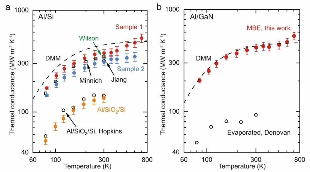 一般来说,对于半导体器件中的界面(半导体-半导体或金属-半导体),传统的扩散失配模型(DMM)认为界面处声子输运是弹性过程,即声子穿过界面能量不发生变化。由于声子在德拜温度下被全部激发,因此在高温下(即温度高于德拜温度),声子穿过界面能量不再随温度变化,其界面热导呈现饱和趋势。然而相对于理论模型,提高界面热导的条件在实验上仍然存在不足。