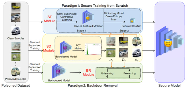 基于投毒的后门攻击对由不可信数据所训练的深度模型构成巨大威胁。在后门模型中,作者观察到毒性样本的特征表示比干净样本的特征表示对图像变换更敏感。它启发作者设计一个敏感性度量,称为关于图像变换的特征一致性(FCT),并提出一个样本区分模块(SD),用以区分不可信训练集中的毒性和干净样本。基于此,该论文提出两种防御方法。第一种方法提出一个两阶段的安全训练模块(ST)来从头训练出一个干净模型。第二种方法提出后门移除模块(BR),通过交替遗忘与重新学习来移除模型中的后门。在三个基准数据集上的大量实验证明的方法在八种后门攻击上的优越防御性能。