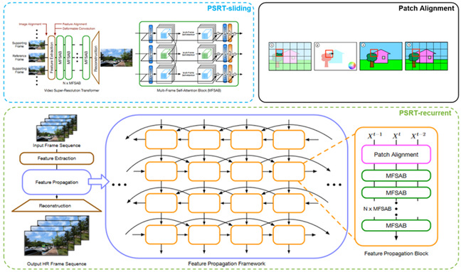 该论文提出了适用于视频超分辨率Transformer的高效对齐方案。先前的方法需要设计复杂的对齐模块处理帧间的不对齐。本文重新思考了现存对齐模块在视频超分中的角色,得出两个结论:(1)视频超分Transformer能够直接从未对齐帧间利用多帧信息 (2)现有的对齐方式会降低视频超分Transformer的性能。通过实验分析发现是光流噪声及传统的重采样方法造成的负面影响。为了高效的解决问题,本文提出基于块的对齐方式,其通过计算patch内部光流的平均值来得到帧间块的对应位置。根据对应关系将块整体移动到对应的位置,保持住像素间的相对位置关系。基于此提出的PSRT-recurrent模型在常用数据集上取得最好的效果。