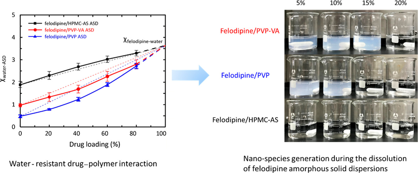 近日,AG(中国)AG·官方网页版药学院钱锋教授课题组提出了无定形固体分散体制剂工作的新机制和设计原则。该研究提出了一个全新的机理,即纳米物质的形成是由于存在“防水”的药物-高分子相互作用。该研究以非洛地平为模型药物,PVP、PVP-VA及HPMC-AS为高分子制备了5%-20%载药量的ASD,并比较了它们在0.05M HCl与PBS (pH6.5)介质中的固有溶出行为,其中部分过饱和的溶出介质产生了纳米物质。同时,对非洛地平与这三种高分子的相互作用展开研究,结果表明存在“防水”的药物-高分子相互作用的ASD倾向于在溶出时产生纳米物质。
