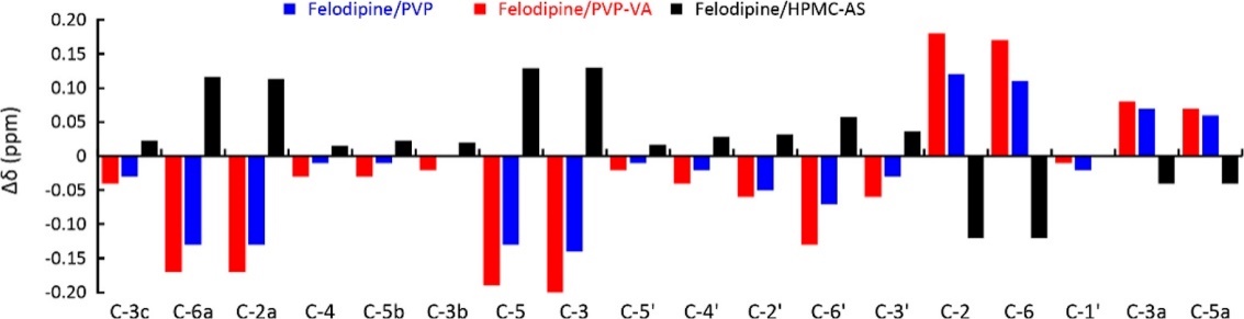 图2.非洛地平在高分子存在时的13C NMR化学位移变化值