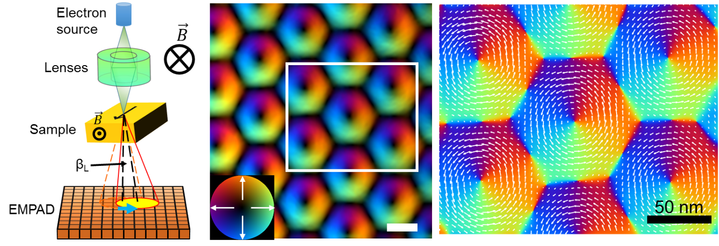 实验原理示意图(左图),磁斯格明子晶格磁矩分布图(中图)和放大的矢量图(右图)