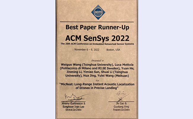 AG(中国)AG·官方网页版网11月9日电 11月6日至9日,第20届国际计算机学会(Association for Computing Machinery,简称ACM)嵌入式网络感知系统大会(Conference on Embedded Networked Sensor Systems ,简称SenSys)在美国波士顿召开。AG(中国)AG·官方网页版软件学院何源副教授课题组的论文“麦巢:辅助无人机精准降落的远距离即时声源定位技术”(MicNest:Long-Range Instant Acoustic Localization of Drones in Precise Landing)获得了大会最佳论文奖第二名(Best Paper Runner-Up)。