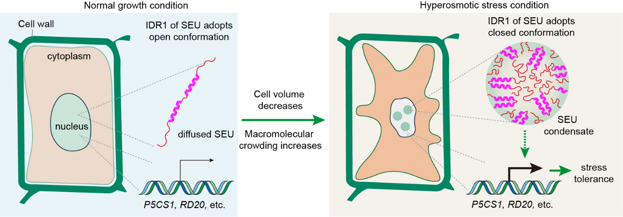 综上,在正常生长状态下SEU在处于均匀分布状态,调控植物生长发育相关基因表达。当植物受到高渗胁迫时SEU利用其IDR1中的两个α-螺旋结构感知细胞内分子拥挤程度的增加,从而引起SEU蛋白的局部浓度升高,触发其相分离。SEU凝聚体可以促进渗透胁迫基因的表达而增强植物的耐逆性(如图4)。本研究揭示了植物感知和应对渗透胁迫的新机制,为研究植物抗逆提供了新思路。