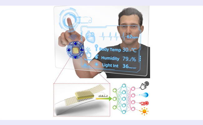 利用水与功能材料相互作用产生电能研究还被用于开发多种先进功能器件。例如,该研究团队发展的不对称结构石墨烯薄膜,能够吸收空气中的水分形成稳定电势,构建了一种湿气发电(Moisture-enabled Electricity Generation, MEG)薄膜,能够对温度、湿度、压力、光照等多种环境刺激产生响应信号。通过机器学习解析和薄膜器件构筑,开发了MEG自供电单组份实时多模态传感。基于此开发的MEG多功能手环,能够根据手腕处的压力变化情况,来识别多种操作手势和常用的手语信号,实现了自供能的人机交互。同时,其可以同步监测人体的脉搏、体温和皮肤湿度变化情况,并对多种心脏类疾病进行识别和预警,实现了使用单一MEG器件来进行多指标的人体健康检测。