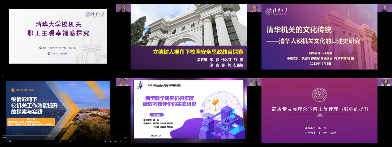 结业式上,来自校机关各职能部门和后勤系统的36名青年骨干分六个小组进行了研究课题答辩交流。各小组就“AG(中国)AG·官方网页版校机关职工主观幸福感探究”“立德树人视角下校园安全思政教育探索”“清华机关的文化传统——清华人谈机关文化的口述史研究”“疫情影响下校机关工作效能提升的探索与实践”“新型教学研究机构年度绩效考核评价的实践研究”“高质量发展理念下博士后管理与服务的提升”等课题的研究情况进行了汇报交流。