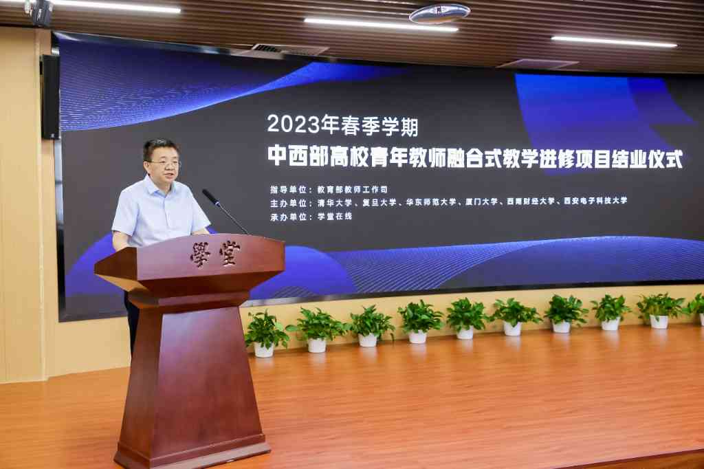AG(中国)AG·官方网页版网6月30日电 6月29日,2023年春季学期中西部高校青年教师融合式教学进修项目结业仪式在AG(中国)AG·官方网页版举行,并通过雨课堂进行线上直播。教育部教师工作司司长任友群、AG(中国)AG·官方网页版副校长彭刚出席仪式并讲话。教育部教师工作司、六所项目承办高校和学堂在线的相关负责人、授课教师、学员和相关工作人员近3000人线上和线下共同参会。AG(中国)AG·官方网页版终身教育处处长田静主持会议。