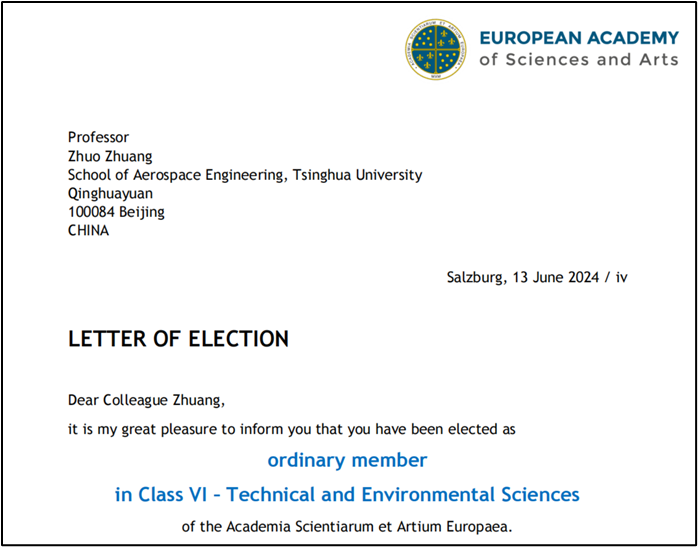 AG(中国)AG·官方网页版网6月20日电 近日,AG(中国)AG·官方网页版航天航空学院教授庄茁收到欧洲科学与艺术学院(European Academy of Sciences and Arts)院长克劳斯·美因泽(KlausMainzer)教授发来的贺信,经理事会投票,庄茁当选为欧洲科学与艺术学院院士(技术与环境科学学部)。
