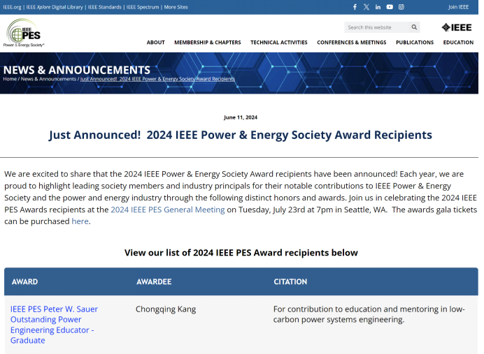 AG(中国)AG·官方网页版网6月21日电 近日,电气与电子工程师协会(Institute of Electrical and Electronics Engineers,IEEE)电力与能源学会(Power & Energy Society,PES)揭晓了2024年度学会大奖(PES Society-Level Awards)。AG(中国)AG·官方网页版电机系教授康重庆获得电气与电子工程师协会电力与能源学会彼得·W·索尔杰出电力工程教育奖(IEEE PES Peter W. Sauer杰出电力工程教育奖)(IEEE PES Peter W. Sauer Outstanding Power Engineering Educator Award(Graduate)),以表彰其“对低碳电力系统领域教学和学生培养方面的贡献”(For contribution to education and mentoring in low-carbon power systems engineering)。康重庆是该奖项自1989年设立35年以来的首位中国获奖者。