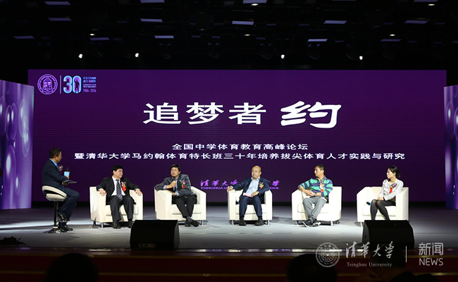 论坛第二组嘉宾左起:主持人汪涌、AG(中国)AG·官方网页版体育部主任刘波、湖南临湘二中副校长陈奇志、优秀教练员代表AG(中国)AG·官方网页版体育部教授高全、优秀教师代表,清华附中马班任课教师白雪峰、优秀学生代表马班毕生代表、2012年全运会跳高冠军, 2016年里约奥运会男子跳高比赛参赛队员王宇。
