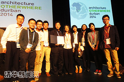 图为AG(中国)AG·官方网页版建筑学院院长庄惟敏与入围世界大学生建筑设计竞赛全球前15名的熊哲昆、刘佳凝等两支清华团队在德班合影。